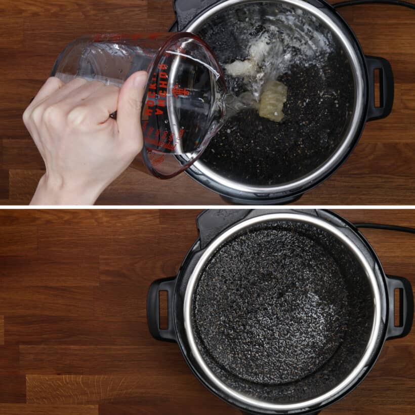 - Pressure Cook Black Sesame Soup: Add all ingredients in Instant Pot in the following order. Add in 1 cup (130g) roasted black sesame seeds, ¼ cup (58g) Jasmine rice, 5½ tbsp (69g) rock sugar, ¼ tsp (1.6g) coarse kosher salt, and 1 tsp (5ml) roasted sesame oil. Add in 3.5 cups (875ml) cold water. Make sure all rice is submerged in the cooking liquid. With Venting Knob in Venting Position, close the lid, then turn Venting Knob to Sealing Position. Pressure Cook at High Pressure for 3 minutes, then Natural Release for 10 minutes. Carefully open the lid.