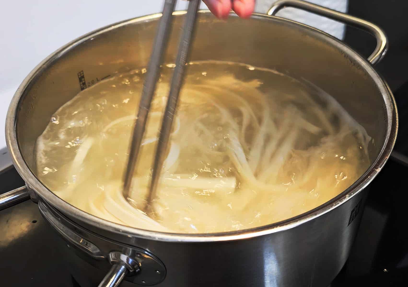 When Instant Pot’s pressure cooking cycle ends and switches to the natural release stage, boil 1.5L water and 1 teaspoon salt on the stovetop. You can also add 1 teaspoon oil to the water to prevent the noodles from sticking together.