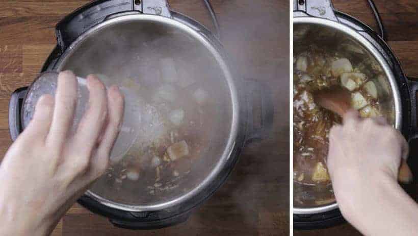 - Deglaze: Add ⅔ cup (188ml) cold water and deglaze by scrubbing all the flavorful brown bits off the bottom.
